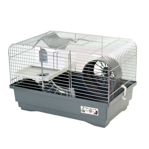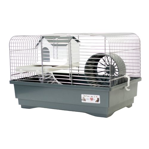 Klietka pre škrečka a ostatné menšie hlodavce s príslušenstvom (kolotoč, domček, poschodie, tunel). Základňa a vybavenie klietky je z plastu, mriežka je zváraná z kovového drôtu chrómovej farby. Farba základne, a kolotoč je tvavo šedý, poschodie je svetlo šedé, domček je biely s tmavo šedou strechou, tunel je priehľadný.
