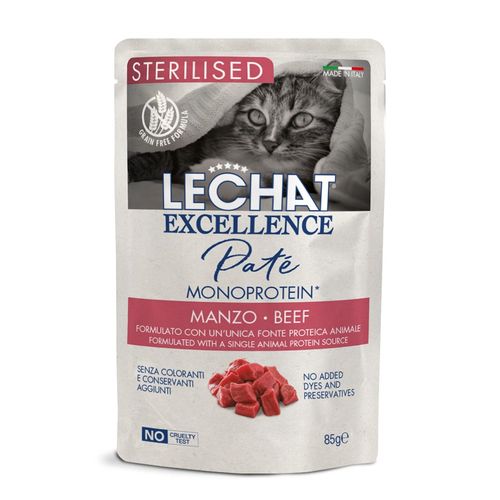 LeChat Excellence Sterilised Cat Paté Monoprotein Beef* je kompletné a vyvážené krmivo pre dospelé mačky. Chutná paštéta bola vyvinutá pre pohodu vašej sterilizovanej mačky vďaka *formulácii s jediným zdrojom živočíšnych bielkovín, hovädzím mäsom, a bez pridaných obilnín. Vyrobené v Taliansku, netestované na zvieratách a bez pridaných farbív a umelých konzervačných látok.