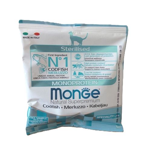 Monge Natural Superpremium Monoprotein Sterilised Cat Treska* je kompletné a vyvážené krmivo pre dospelé mačky. Formulované pre pohodu vašej sterilizovanej mačky vďaka nízkemu obsahu tuku a vysokému obsahu bielkovín na udržanie ideálnej telesnej hmotnosti a na podporu svalovej hmoty. *Formulované s jedinečným zdrojom živočíšnych bielkovín (treska), obohatené o Xylo-oligosacharidy (XOS), prebiotiká na podporu črevnej pohody. Zahrnutie vybraných zložiek, ako je šípka s antioxidačnými zlúčeninami na neutralizáciu voľných radikálov, a yucca schidigera na obmedzenie črevných pachov, je výsledkom talianskeho výskumu na podporu kvality života vašich mačiek. Bez pridaných farbív a umelých konzervantov. *Môže obsahovať stopy iných zdrojov bielkovín.