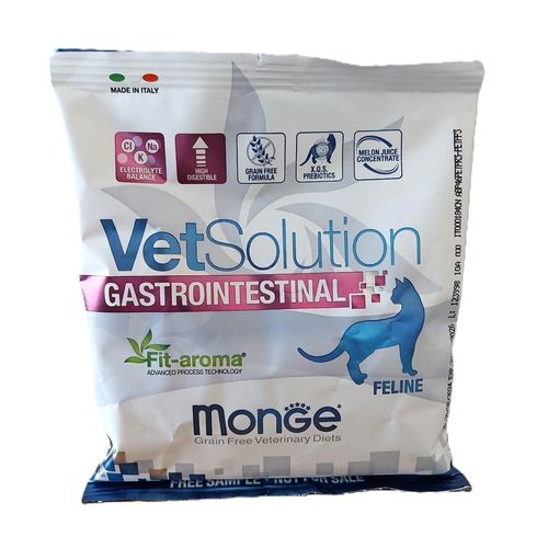 Monge VetSolution Gastrointestinal Feline je kompletné dietetické krmivo pre mačky formulované na zníženie porúch črevnej absorpcie. Obsahuje koncentrát melónovej šťavy na neutralizáciu voľných radikálov, pagaštan konský na podporu čriev a Xylo-oligosacharidy (XOS) na zabezpečenie črevnej mikroflóry. Vysoko stráviteľné krmivo so zvýšeným obsahom sodíka a draslíka.