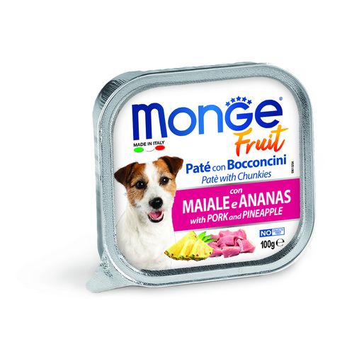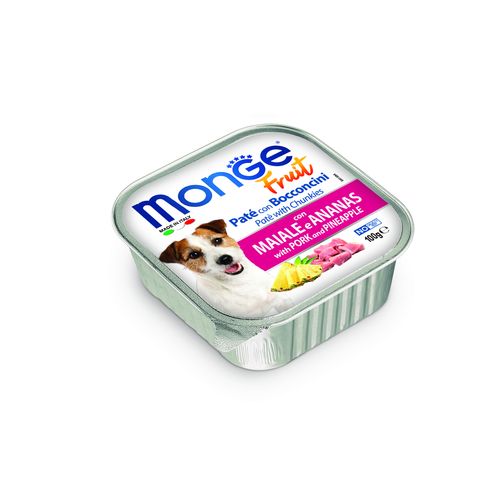 Táto lahodná paštéta s kúskami čerstvého bravčového mäsa a ovocím, ktoré je prírodným zdrojom vitamínov a minerálov, je kompletné a stráviteľné krmivo určené na každodennú podporu pohody dospelých psov. Mäkká a chutná paštéta s kúskami je ideálna pre malé psy a ako pochúťka pre väčšie psy. Monge Fruit je vyrobené v Taliansku, bez testovania na zvieratách a bez umelých farbív a konzervačných látok.