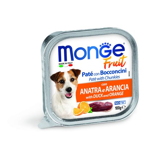 Táto lahodná paštéta s kúskami čerstvého kačacieho mäsa a ovocím, ktoré je prírodným zdrojom vitamínov a minerálov, je kompletné a stráviteľné krmivo určené na každodennú podporu pohody dospelých psov. Mäkká a chutná paštéta s kúskami je ideálna pre malé psy a ako pochúťka pre väčšie psy. Monge Fruit je vyrobené v Taliansku, bez testovania na zvieratách a bez umelých farbív a konzervačných látok.