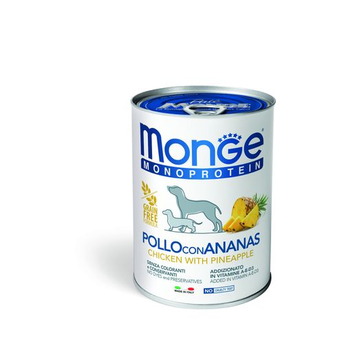 Paštéta *formulovaná s jediným zdrojom živočíšnych bielkovín, najvyššej kvality, vybraným kuracím mäsom a ovocím, ktoré je prírodným zdrojom minerálov a vitamínov. Produkt je 100% taliansky a má vysokú chutnosť. Ide o vyvážené krmivo, ktoré obsahuje komplex vitamínov A-E-D3 a esenciálne mikroživiny. Prirodzene bez farbív, konzervačných látok a pridaných cukrov.