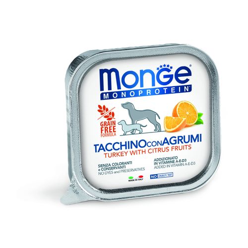 Paštéta zložená z jedinečného zdroja živočíšnych bielkovín – vybraného morčacieho mäsa najvyššej kvality, s ovocím – prírodným zdrojom minerálov a vitamínov. 100% talianske a vysoko chutné produkty. Vyvážené krmivo s komplexom vitamínov A-E-D3 a esenciálnymi mikroživinami. Prirodzene bez farbív, bez konzervačných látok a bez pridaného cukru.