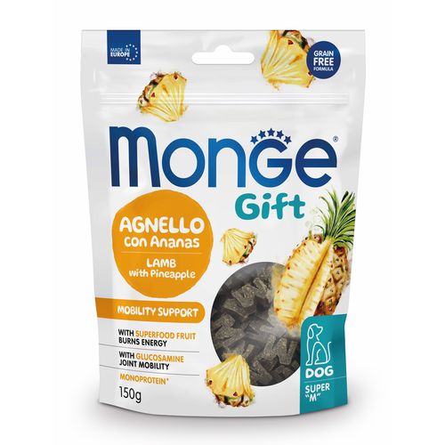 Monge Gift Mobility Support Dog Jahňacie s ananásom je doplnkové krmivo pre dospelé psy. Bolo špecificky vyvinuté pre celkovú pohodu vášho psa vďaka obsahu L-karnitínu pre udržanie štíhlej svalovej hmoty. Produkt je formulovaný bez obilnín a s jediným zdrojom živočíšnych bielkovín* – jahňacím mäsom, ktoré je cenným zdrojom vysoko stráviteľných bielkovín s vysokou biologickou hodnotou. Zloženie je obohatené o vitamíny pre každodennú vitalitu a o glukozamín, zdroj živín pre kĺbové chrupavky. Zahrnutie superpotraviny, ako je ananás, zdroj antioxidantov na podporu mobility, je výsledkom výskumu „Made in Italy“ na podporu kvality života našich psov. Bez pridaných umelých farbív a cukrov.