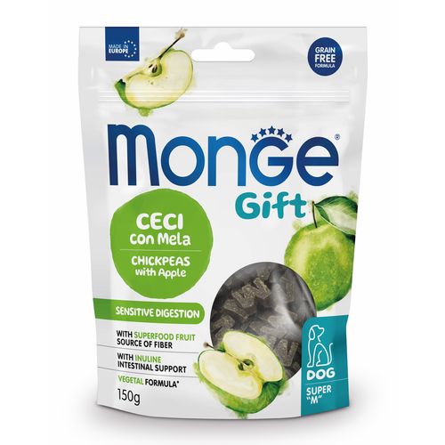 Monge Gift Sensitive Digestion Dog Cícer s jablkom je doplnkové krmivo pre dospelé psy. Bolo špecificky vyvinuté pre celkovú pohodu vášho psa vďaka obsahu L-karnitínu pre udržanie štíhlej svalovej hmoty. Produkt je formulovaný bez obilnín a s rastlinnými zdrojmi bielkovín*, ako je cícer, ktorý je cenným alternatívnym zdrojom aminokyselín. Zloženie je obohatené o vitamíny pre každodennú vitalitu a o inulín na podporu črevnej pohody. Zahrnutie superpotraviny, ako je jablko, zdroj rozpustnej vlákniny pre črevnú mikroflóru, je výsledkom výskumu „Made in Italy“ na podporu kvality života našich psov. Bez pridaných umelých farbív a cukrov.