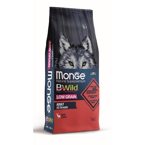 MONGE BWild Low Grain Adult 12 kg kompletné krmivo pre dospelých psov všetkých plemien s jelením mäsom so znížením obsahom obilnín