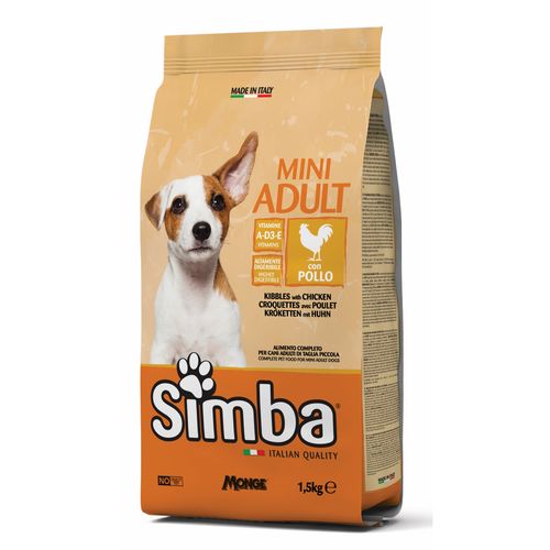 SIMBA DOG KIBBLES WITH CHICKEN je kompletné krmivo pre dospelých psov malých plemien. Receptúra bola vyvinutá so špeciálnou kombináciou vitamínov A-D3-E, aby spĺňala nutričné potreby psov. Vyvážená výživa formulovaná s kvalitnými prísadami, ako je kuracie mäso, zdroj bielkovín a minerálov, vybrané pre svoju prirodzenú schopnosť uspokojovať denné potreby zvierat. Bez pridaných farbív a umelých konzervačných látok.