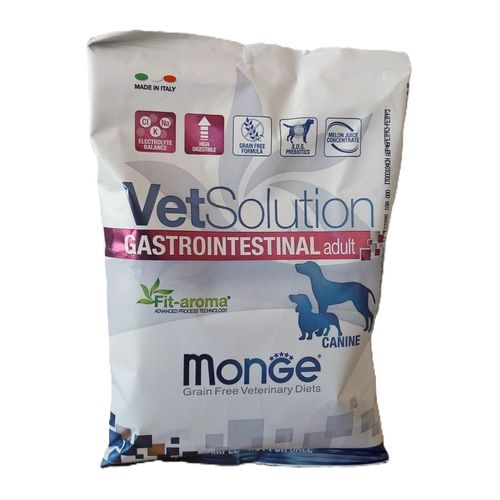 Monge VetSolution Gastrointestinal Canine Adult je kompletné diétne krmivo pre psov, špeciálne vyvinuté na zníženie porúch črevnej absorpcie. Toto vysoko stráviteľné krmivo so zvýšeným obsahom sodíka a draslíka je obohatené o cenné zložky pre podporu zdravia čriev. Obsahuje koncentrát melónovej šťavy na neutralizáciu voľných radikálov, pagaštan konský pre podporu funkcie čriev a Xylo-oligosacharidy (XOS) na udržanie zdravej črevnej mikroflóry.